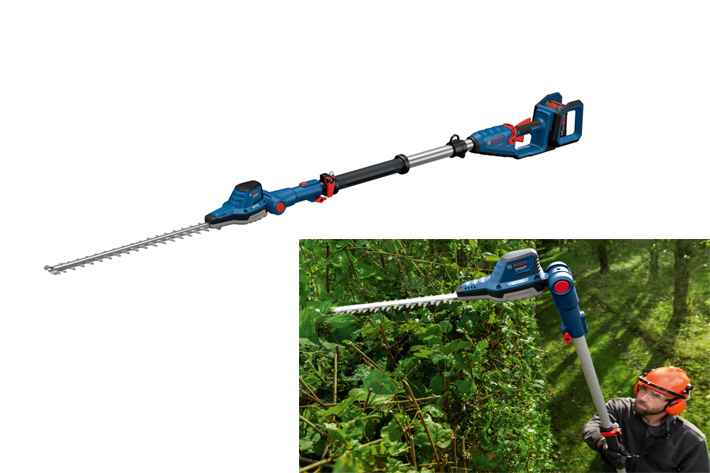 Ergonomique, le nouveau taille-haies télescopique sans-fil GHE 18V-50TP Bosch Professional réalise des tailles exigeantes de grandes haies. Alimenté par un moteur sans charbon, il garantit des performances élevées et une grande longévité.