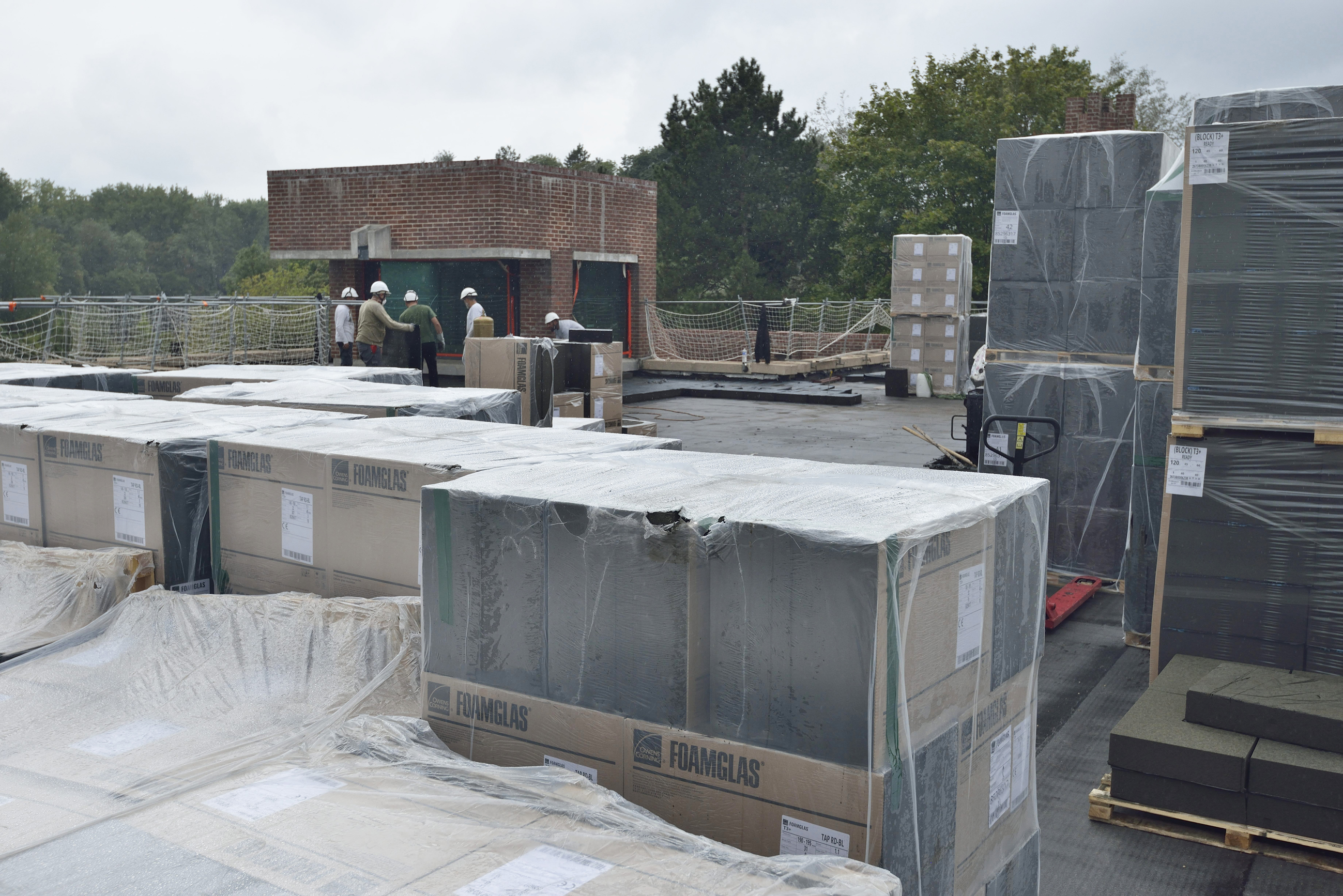 Pour répondre aux spécificités techniques des toitures, deux systèmes ont été mis en œuvre : le FOAMGLAS® READY TAPERED T3+ à pente intégrée, utilisé pour les 5 500 m² de toitures sur support béton, et le FOAMGLAS® READY T3+ plat, mis en œuvre sur les 3 500 m² de toitures sur support en acier. Quel que soit le support, les plaques FOAMGLAS® ont été collées à chaud (Enduit d’Application à Chaud), un procédé sous Avis Technique renouvelé depuis mars 2025.