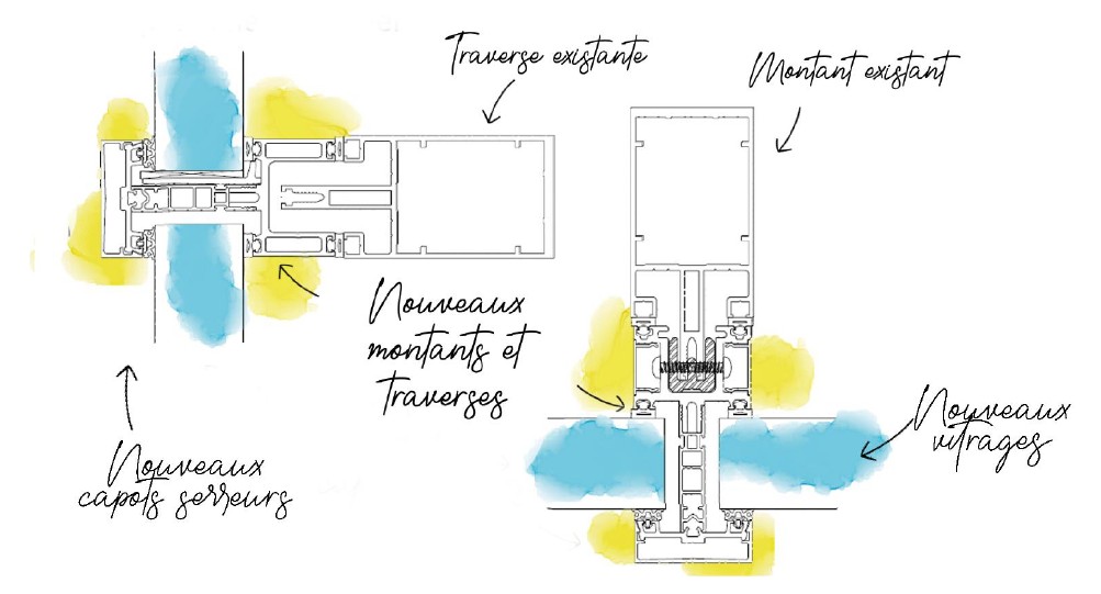 Avant de débuter les travaux, il est essentiel d’analyser la compatibilité de « RE-NOUVELER LA FAÇADE » avec la géométrie des profilés existants, et de valider par un bureau d’études indépendant l’inertie des montants, les fixations et les efforts d’arrachement des vis de fixation.