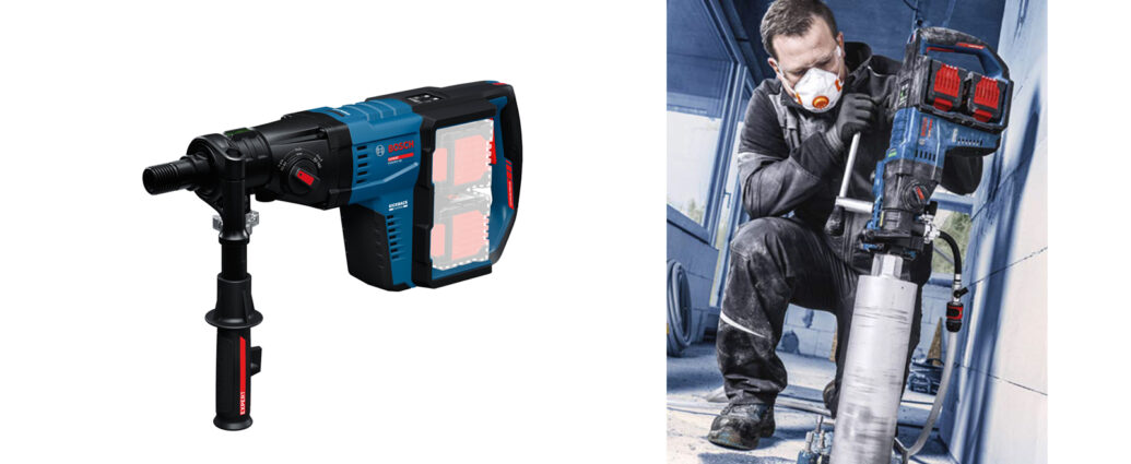 Compatible avec le support de forage diamanté GCR 180 (II) Professional, elle peut percer de grands trous dans du béton ou de la maçonnerie sur un mur, un plafond ou au sol.