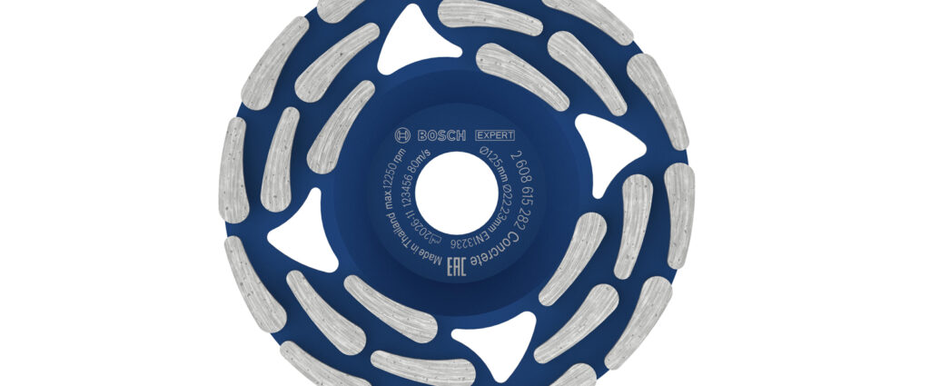 De conception innovante, avec ses trois rangées de segments diamantés aérodynamiques, la nouvelle meule assiette diamantée béton Bosch EXPERT Long Life offre des performances de ponçage de béton et une durée de vie exceptionnelles (4 fois supérieure à celle de la gamme Bosch standard). Associées à de grandes fentes d’évacuation de la poussière, elle permet d’éliminer efficacement les résidus de matière.