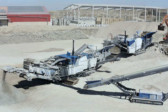 Suivant les exigences et les besoins, les installations sont employées sur le site de recyclage de RECICAM dans différentes combinaisons. Ainsi, le broyeur à mâchoires MOBICAT MC 120i PRO et le concasseur à percussion MOBIREX MR 130i PRO forment un tandem de choc quand il s’agit de traiter du matériau d’alimentation de grande taille : Ces deux machines traitent ensemble des matériaux jusqu’à des tailles de 1 200 mm et fournissent un produit final de qualité exceptionnelle. Le débit est de max. 250 tonnes par heure. En associant un broyeur à mâchoires et un concasseur à percussion, on produit des granulométries finales de 0-20 et 20-40 mm, suivant la charge des surfaces de criblage.