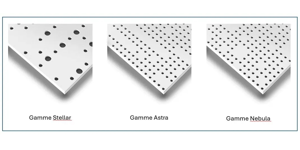 Stellar est un motif de perforations aléatoires qui s’inspire des constellations. En choisissant cette esthétique graphique, les prescripteurs créent une carte céleste contemporaine. Une harmonie visuelle idéale pour structurer les volumes avec légèreté. Stellar permet également d’offrir un confort acoustique maîtrisé. Chaque plaque possède un taux de perforation de 9 % garantissant une absorption comprise (αw) entre 0,45 sans laine de verre et 0,50 avec une laine de verre de 60 mm (plénum de 200 mm).