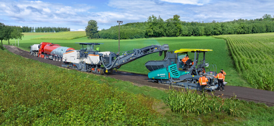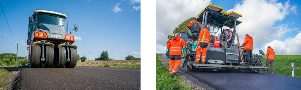 Le matériau est chargé directement depuis le recycleur à froid dans le finisseur Vögele, puis posé. À Markt Indersdorf, les machines ont atteint un taux de production de 360 tonnes par heure. Aucun transport d’évacuation, aucun entreposage ni aucun nouveau matériau pour la couche portante n’ont été nécessaires.